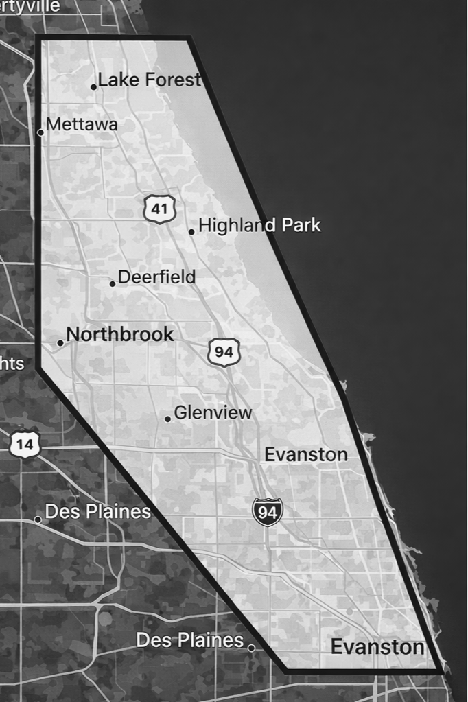 Chicago’s North Shore + nearby suburbs. If you’re inside this area, we can usually schedule a walkthrough within a few days.